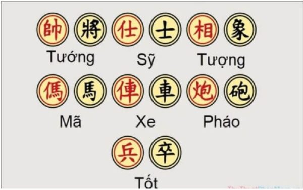 Anh Em sẽ thấy được nửa bàn cờ với 16 con cờ với 7 loại quân Tướng 1 quân.Sỹ 2 quân . Tượng 2 quân . Xe 2 quân. Pháo 2 quân. Mã 2 quân.Tốt 5 quân. .