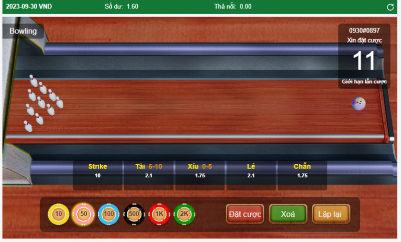 Lưu ý đầu tiên anh em nhớ chọn bet cược, với trò này bet cược nhỏ nhất là 10k lớn nhất là 2000k. Gồm 5 cửa trúng Strike 1 trúng 10, Tài 6-10 1 trúng tỉ lệ 2.1, Xỉu 0-5 1 trúng 1.75, Lẻ 1 trúng 2.1, Chẵn 1 trúng 1.75.