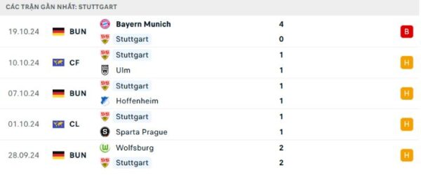 Bên kia sân, Stuttgart sau khi phải chịu thất bại đáng tiếc trước Real Madrid khi trở lại giải đấu cấp câu lạc bộ hàng đầu châu Âu, HLV Sebastian Hoeness đã chứng kiến Stuttgart bị đối thủ yếu là Sparta Prague cầm hòa 1-1 ngay trên sân nhà. Theo thống kê, Stuttgart chỉ thắng 3 trong số 19 trận gần nhất tại Champions League trong vài thập kỷ qua. Và quan trọng hơn, phong độ hiện tại của họ là quá tệ với mạch 5 trận không thắng trên mọi đấu trường, mới nhất là trận thua thảm Bayern Munich (0-4) đêm Chủ nhật.
